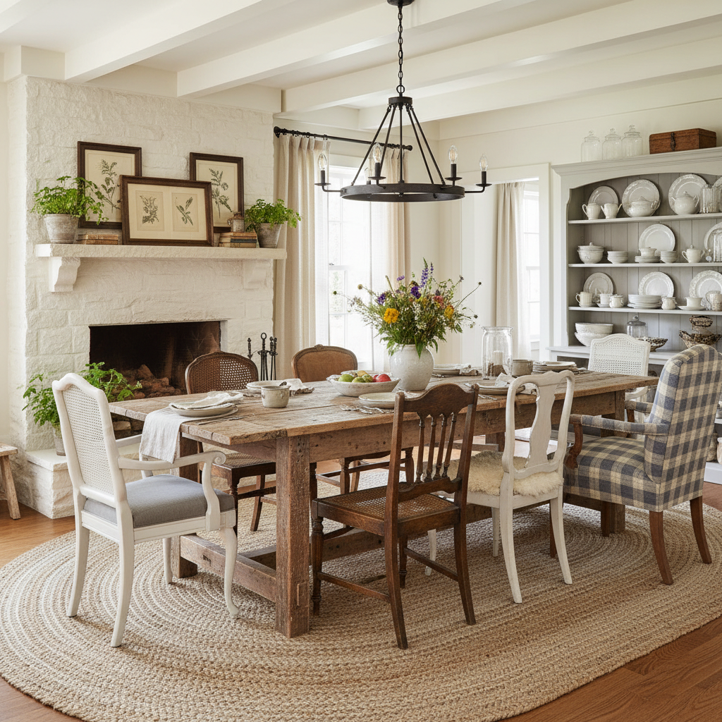 Create a warm and inviting dining room reminiscent of a countryside home. This style centers on natural wood—a large, sturdy farmhouse table is essential, often paired with classic Windsor chairs or comfortable upholstered benches. A palette of creamy whites, soft greens, and earthy browns dominates. Materials include distressed wood, wrought iron, and rustic textiles like burlap or cotton. The mood is cozy, authentic, and wonderfully welcoming, perfect for family gatherings.