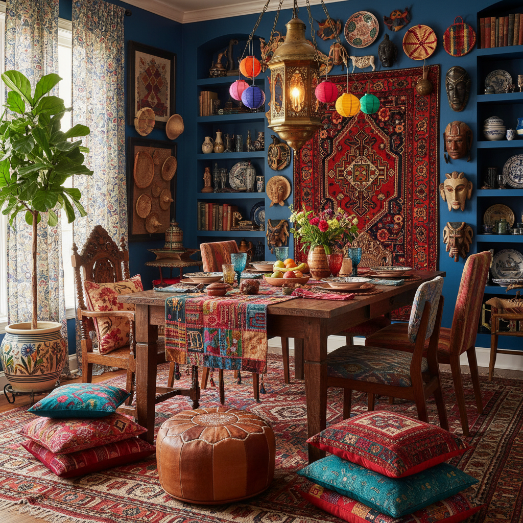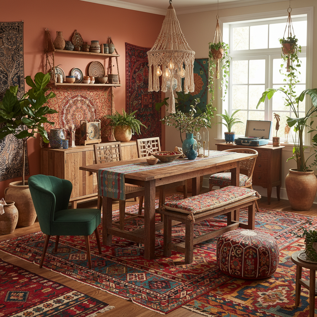 Infuse your dining space with global flair and free-spirited artistry. This style thrives on a rich tapestry of patterns, textures, and colors—think deep jewel tones, earthy neutrals, and vibrant accents. A large, rustic wood table or a low-slung communal table can anchor the space, surrounded by an eclectic mix of seating, from floor cushions to woven rattan chairs. Adorn with macrame hangings, potted plants, and layered rugs for a warm, inviting, and wonderfully unconventional mood.