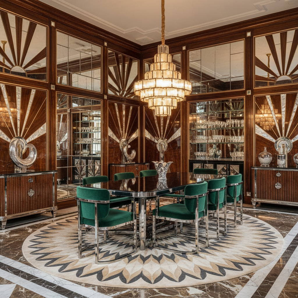 Step back into the roaring twenties with a dining room exuding opulence and sophisticated drama. This makeover features a rich color scheme of black, gold, emerald green, or sapphire blue. Materials are luxurious—velvet, polished brass, mirrored surfaces, and dark lacquered wood. Furniture boasts geometric patterns, sleek curves, and often a high-gloss finish. A statement chandelier is a must. The atmosphere is lavish, elegant, and undeniably glamorous.