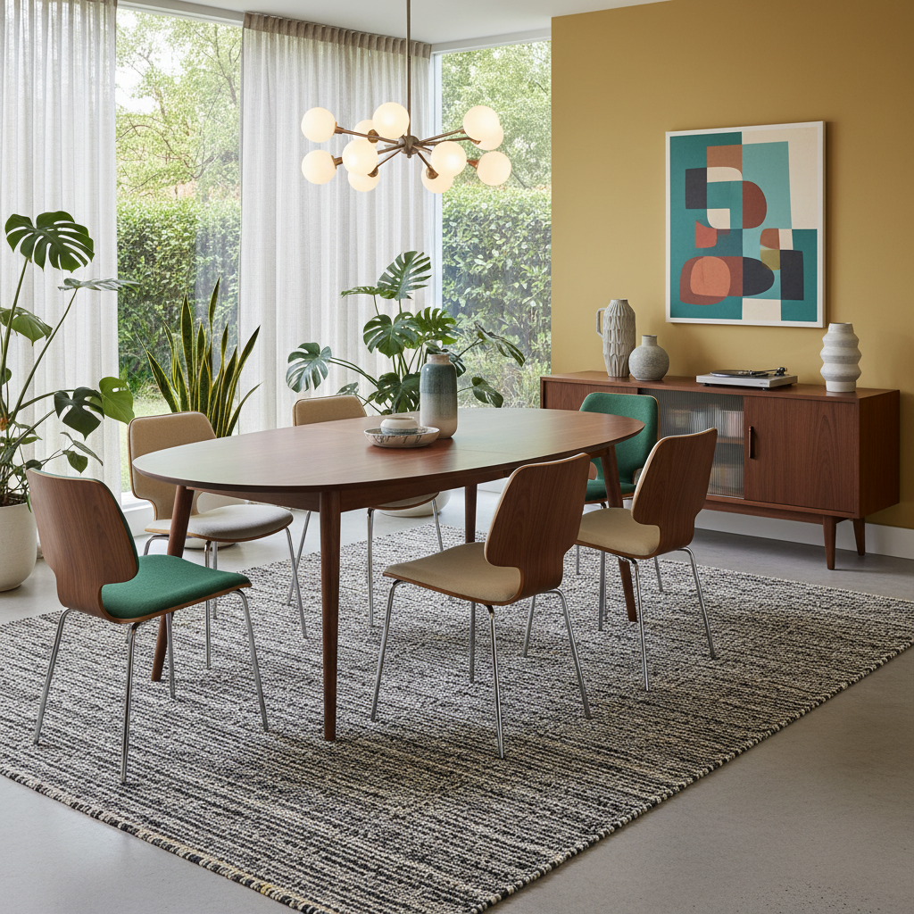 Revisit the iconic designs of the 1950s and 60s with this vibrant and functional style. A key element is a sleek, often round or oval, walnut or teak dining table, surrounded by classic chairs like Eames or Saarinen reproductions. The color palette includes earthy tones mixed with vibrant pops of orange, teal, or avocado green. Materials are wood, plastic, and metal. The mood is optimistic, stylish, and timelessly cool.