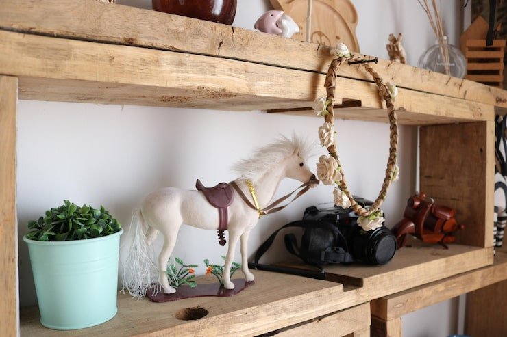 Decorate your shelves with vintage items, baskets, or decorative objects.