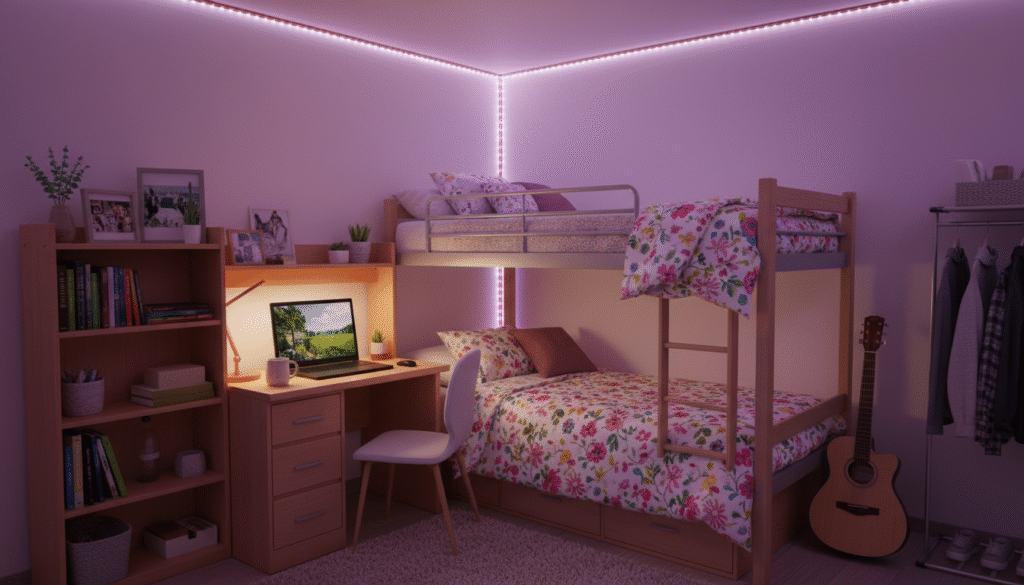 LED strips are a staple in modern dorm aesthetics.