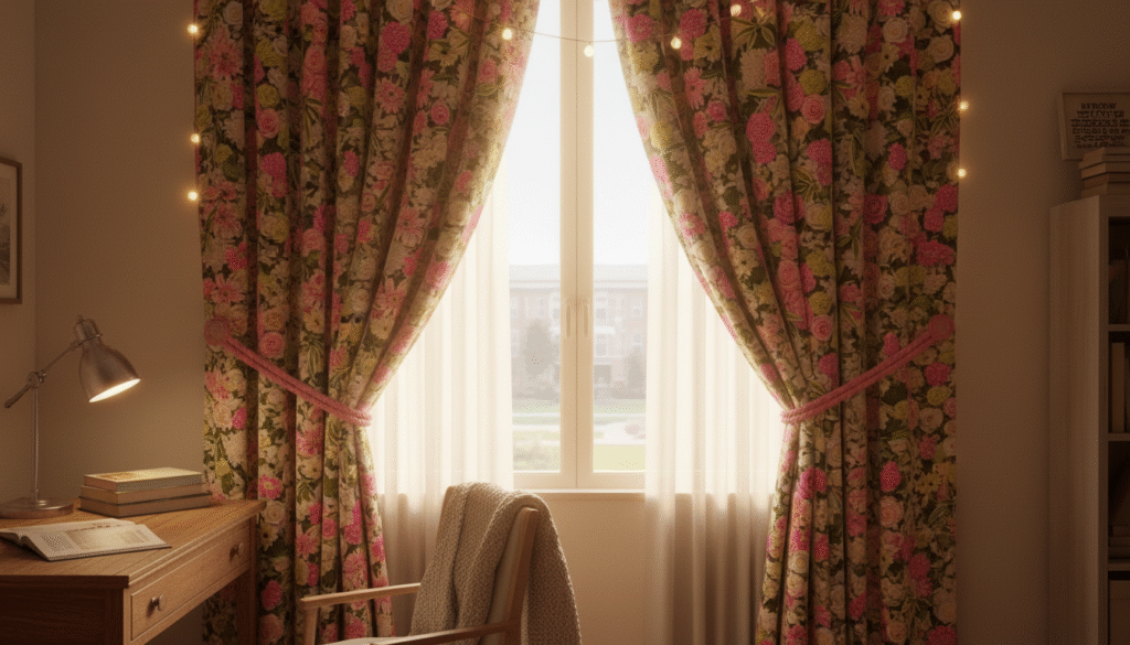 If your dorm allows it, hanging curtains adds instant coziness.