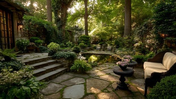 Lighting transforms the garden into a magical oasis at night. Choose warm-toned lights for a cozy mood. Avoid harsh white lights because they disrupt the relaxing atmosphere.
