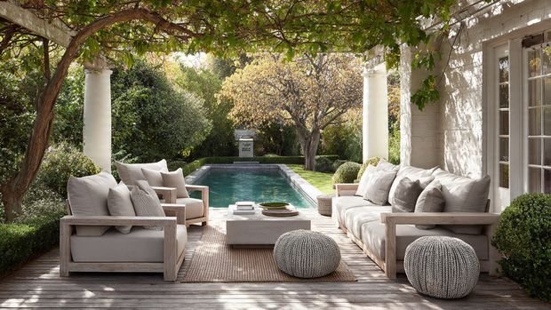 Outdoor textiles add coziness and charm. Think cushions, throws, rugs, and curtains made for outdoor use.