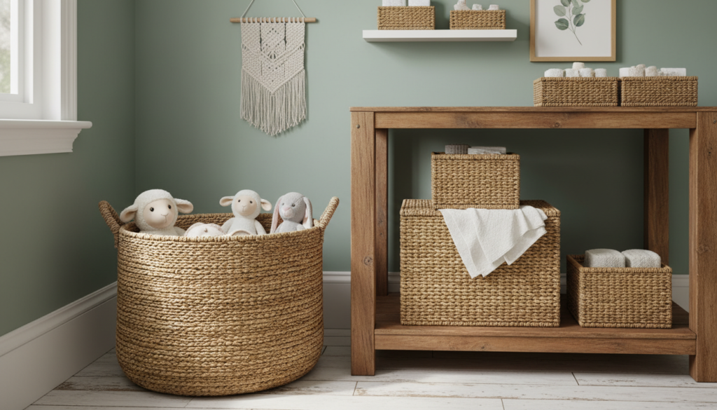 Functionality meets style with woven baskets. Rattan, wicker, or seagrass baskets are perfect for stashing diapers, blankets, toys, and laundry. Their natural texture and organic shapes enhance the farmhouse aesthetic while keeping the nursery tidy and organized. Place larger baskets on the floor and smaller ones on shelves or changing tables.
