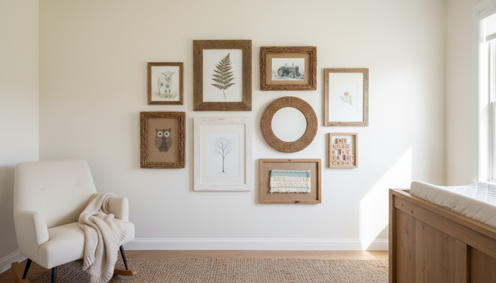 Personalize the nursery with a rustic gallery wall. Mix framed family photos, charming illustrations of nature or farm animals, and small wooden signs with sweet sayings. Use a variety of frame styles—distressed wood, simple black, or even ornate vintage—to add visual interest and a curated feel.