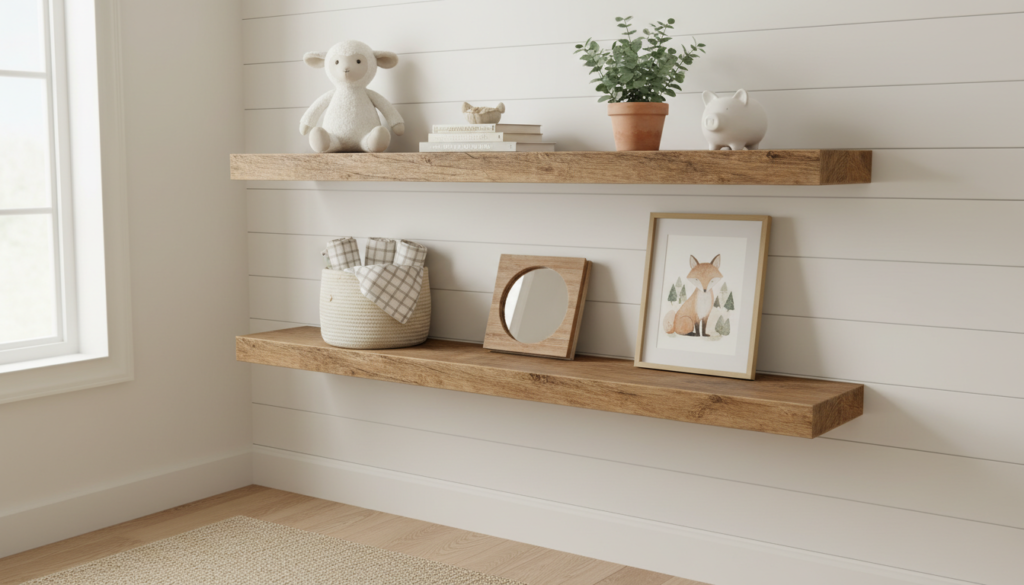 Open shelving is both practical and decorative in a farmhouse nursery. Use sturdy wooden shelves to display charming books, small decorative items like ceramic animals, tiny plants, or framed photos. This allows for easy access to frequently used items while also adding visual appeal.