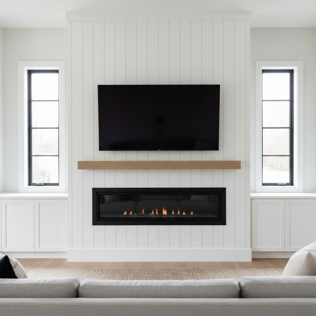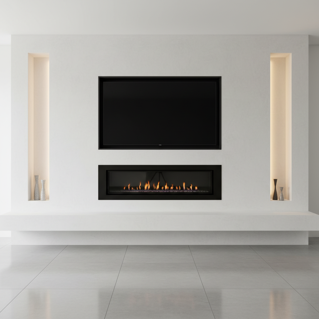Create striking contrast with a pristine white plaster feature wall, punctuated by a dark, minimalist firebox and a matching dark frame around the television. This high-contrast approach feels crisp, contemporary, and visually impactful. Pair with black metal accents and clean-lined furniture for a sophisticated urban feel.