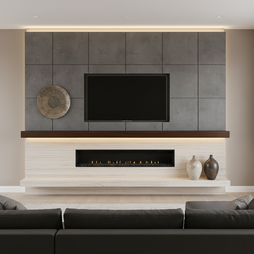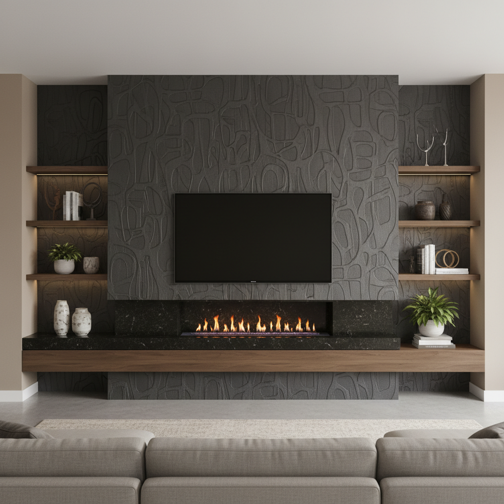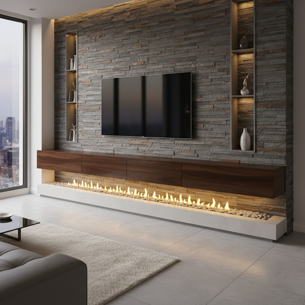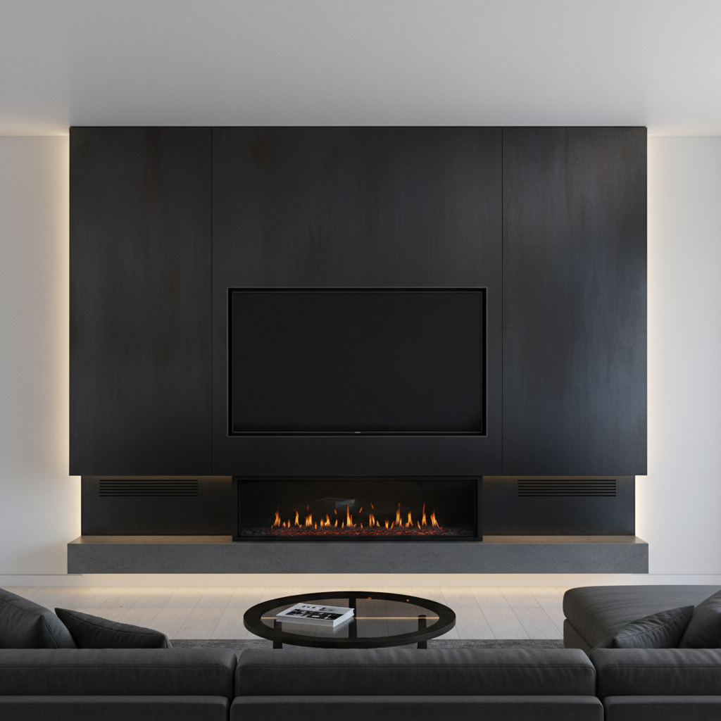 For a sleek, masculine, and highly contemporary look, clad your feature wall in blackened steel panels. The dark, reflective surface makes the TV almost disappear when off. A linear gas fireplace enhances the minimalist aesthetic. Pair with deep-toned leather, dark woods, and sharp, angular furniture.