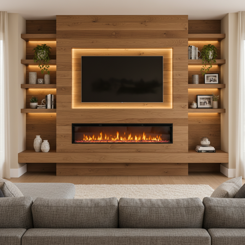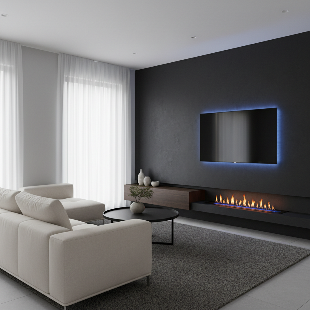 Make a dramatic statement with a deep, moody accent wall in charcoal, navy, or forest green. The fireplace is a minimalist, linear design. The TV is mounted with subtle LED backlighting, creating a halo effect that minimizes its harsh presence and adds ambiance. This design feels intimate and contemporary, perfect for evening entertainment.