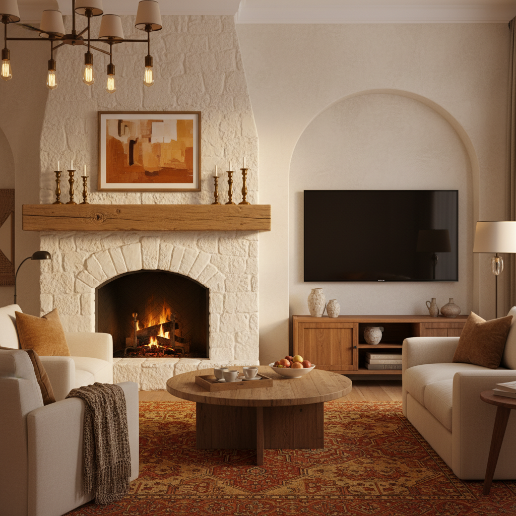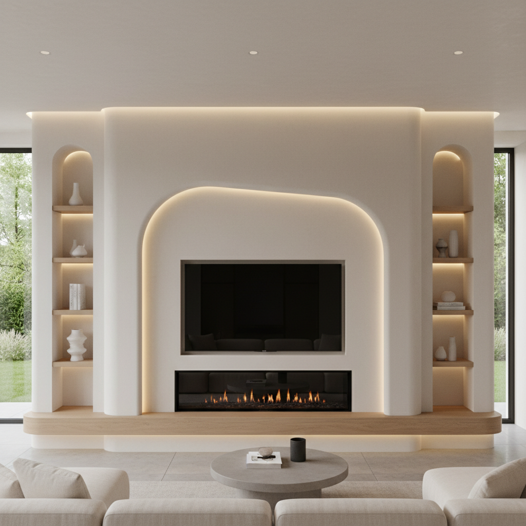 Embrace a soft, organic modern aesthetic with a smooth, hand-troweled plaster finish. Incorporate gentle curves or arched niches around the fireplace and TV. This creates a sculptural, bespoke feel with a serene mood. Natural wood furniture, soft textiles, and potted greenery enhance the calming atmosphere.
