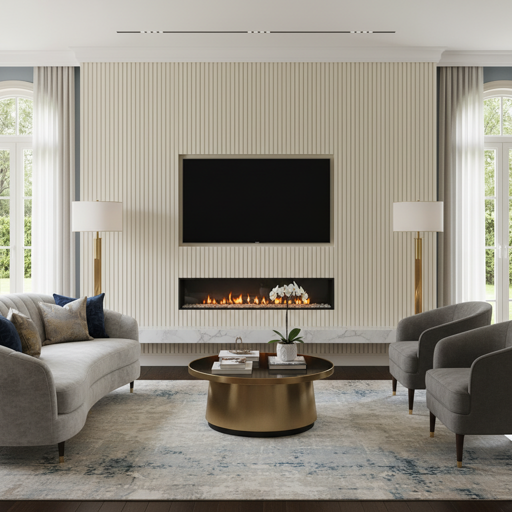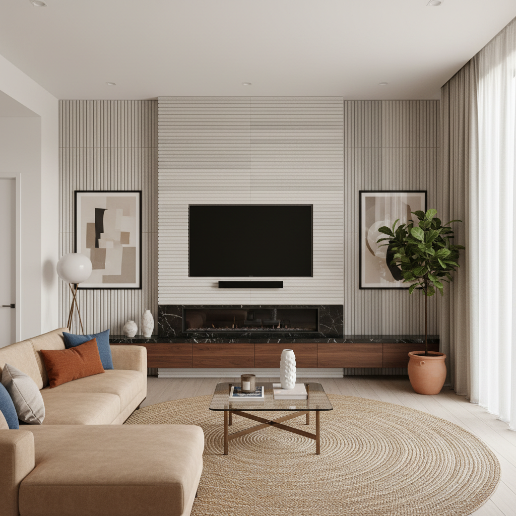 Add subtle texture and sophistication with fluted wood or MDF panels painted in a refined color like deep olive or warm beige. The vertical lines draw the eye upward, creating a sense of height. The TV is mounted flush, blending seamlessly into the textured surface. This style pairs beautifully with mid-century modern furniture and brass details.