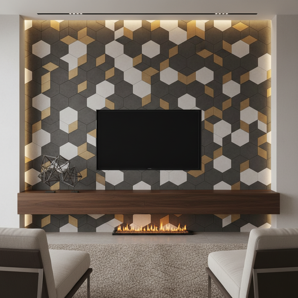 Inject personality with a striking geometric tile pattern for your feature wall, perhaps in a black and white or a muted color scheme. A simple floating mantel keeps the look clean. The TV is mounted centrally, becoming part of the overall pattern. This creates a modern, artistic focal point that feels fresh and energetic.
