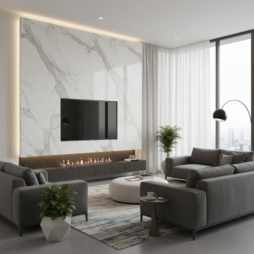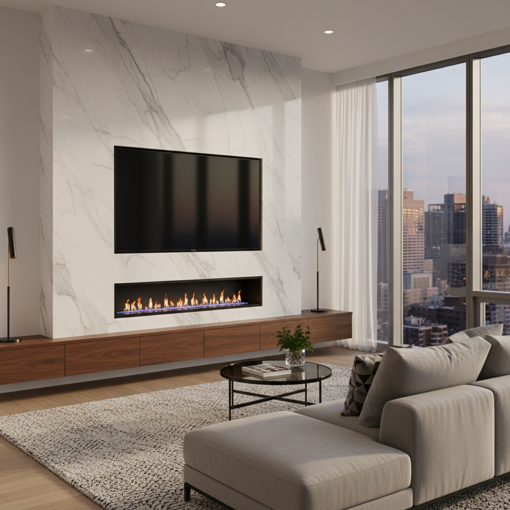 Achieve ultimate sleekness with an oversized single slab of marble or porcelain that houses both a linear gas fireplace and a recessed TV. The scale of the slab itself becomes the statement, with minimal breaks. This design speaks to refined luxury and a highly curated aesthetic. Keep other elements simple and sculptural.