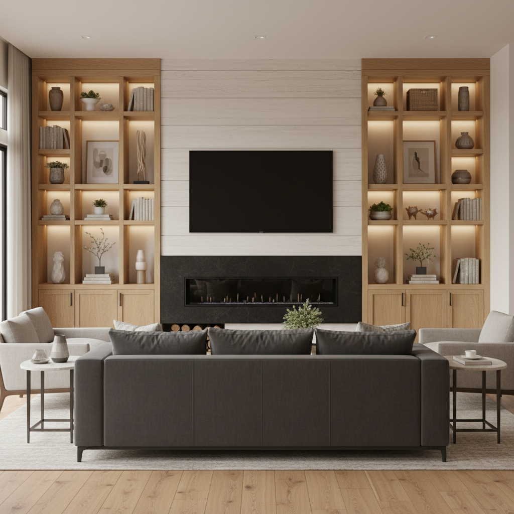 Create a functional and beautiful display by flanking a central fireplace and TV with custom built-in shelving. Use a monochromatic palette of crisp white or deep charcoal for the cabinetry. The shelves offer space for curated decor, books, and art, framing the TV as part of an intentional gallery wall. This design offers a balanced and organized feel.