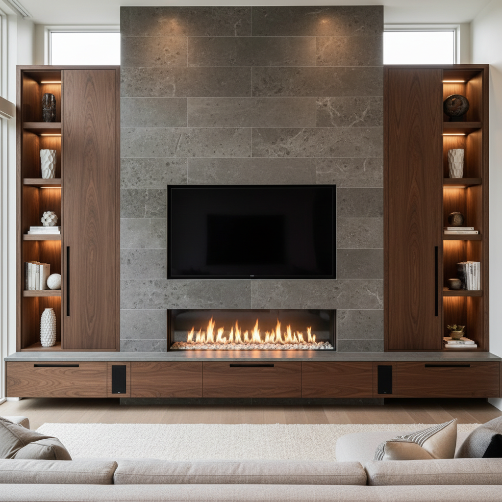 Design a comprehensive media wall with the fireplace at its heart. Custom cabinetry and drawers below the TV provide ample storage for electronics, remotes, and media. A consistent material, like painted MDF or a light wood veneer, unifies the entire unit. This offers a highly functional and clutter-free living space.