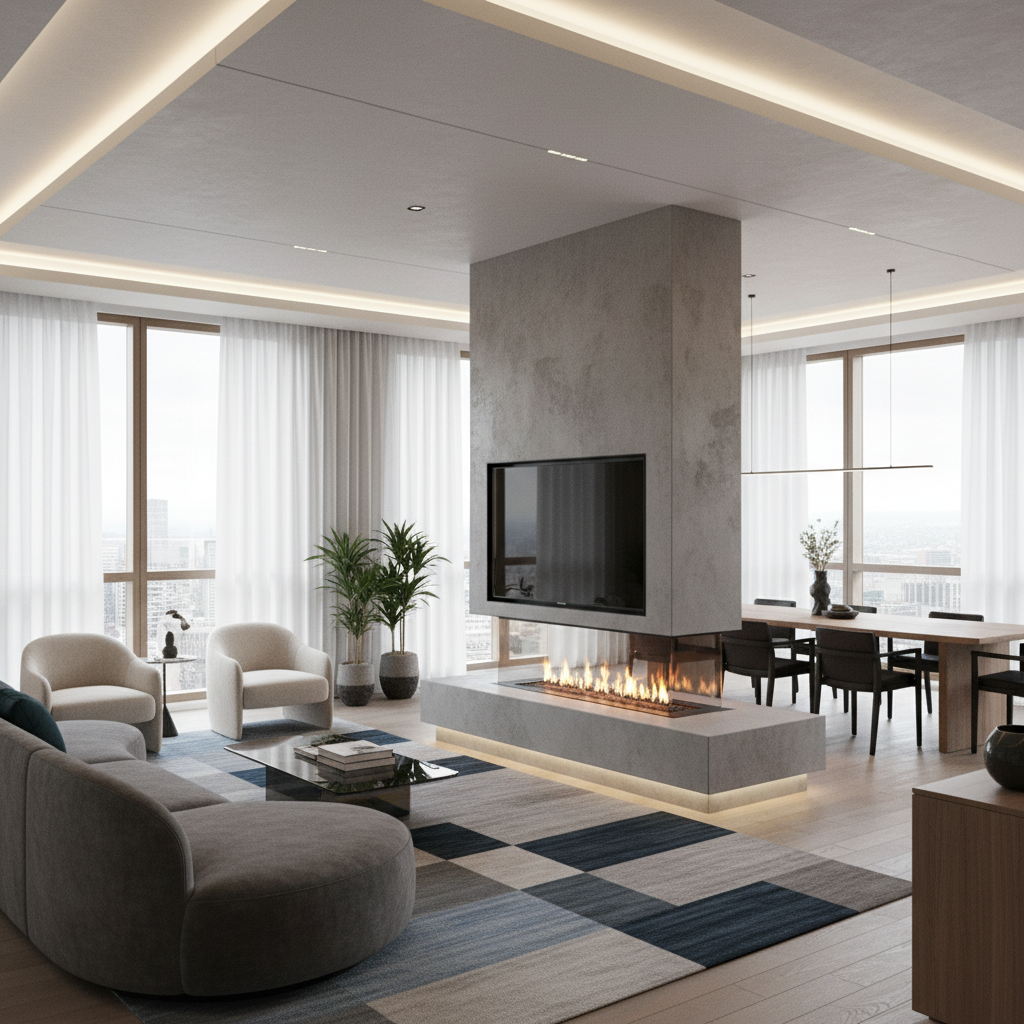 For open-plan spaces, consider a central fireplace island that serves as a room divider. Mount the TV above the fireplace on one side, making it a focal point for a specific zone. Use materials like honed granite or concrete for a substantial, architectural presence. This creates a versatile and dramatic centerpiece.