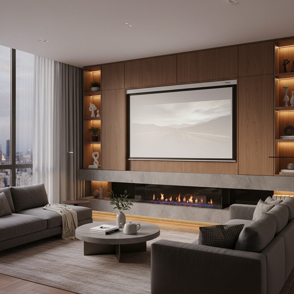 For the ultimate cinematic experience without a permanent TV presence, install a hidden projector screen that descends from the ceiling above the fireplace. When not in use, the wall remains a pristine design surface. This offers maximum flexibility and a truly transformative viewing experience, perfect for dedicated home theater enthusiasts who value a clean aesthetic.