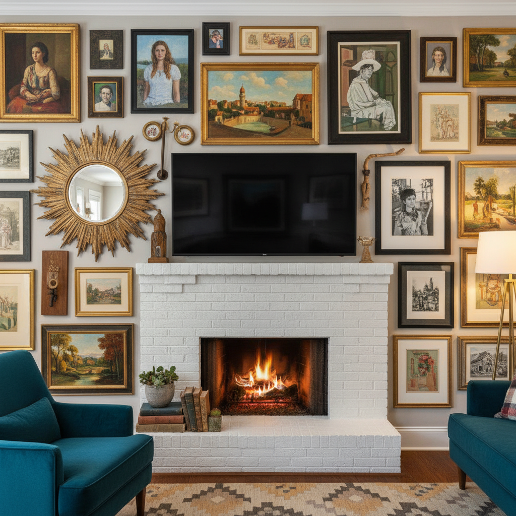For the maximalist or art enthusiast, surround your fireplace and TV with a curated gallery wall. Mix framed prints, photographs, and sculptural pieces of varying sizes. The TV becomes one ‘piece’ within the collection, blending into the artistic display. This creates a vibrant, personal, and eclectic living space.