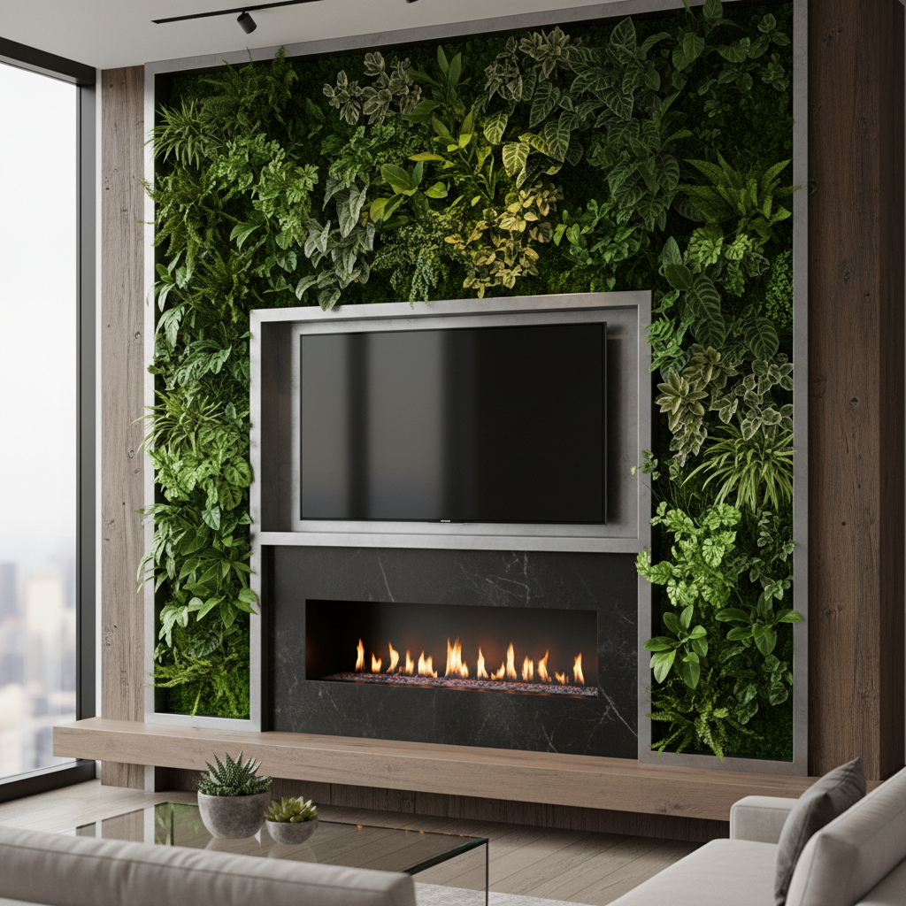 Introduce biophilic design with a vertical garden wall (real or artificial) surrounding the fireplace and TV. This unexpected element brings nature indoors, creating a fresh, vibrant, and unique focal point. The TV can be framed by the greenery, softening its presence. This style promotes a serene and healthy atmosphere.