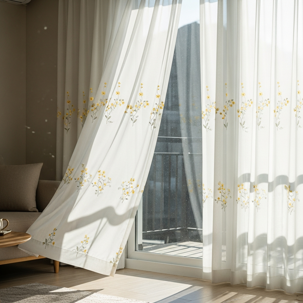 Replace heavy drapes with sheer or lightweight cotton curtains featuring delicate floral embroidery. As the spring sun shines through, the shadows of the embroidered patterns will create a beautiful, dancing effect on your living room floors.