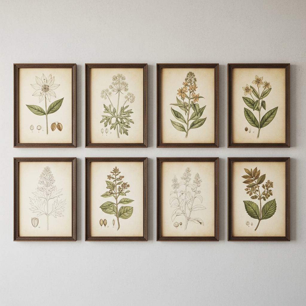 Curate a collection of vintage botanical illustrations. These detailed drawings of plants and flowers add an intellectual and sophisticated touch to the room. Use matching frames for a cohesive look or mixed frames for an eclectic feel.