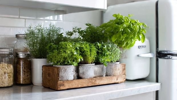 Create a mini herb garden on top of your fridge using small pots or planters.