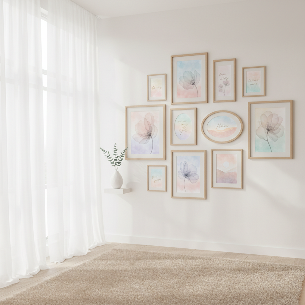 Create a gentle and serene space with a pastel dream gallery wall. Use art featuring soft hues—blush pinks, mint greens, sky blues, and creamy yellows. Abstract art, floral prints, or whimsical illustrations work beautifully. Choose light wood frames or simple white frames to maintain the airy feel. Pair with light-colored, soft-textured furniture like linen sofas and fluffy rugs, fostering a calm, sweet, and comforting atmosphere.
