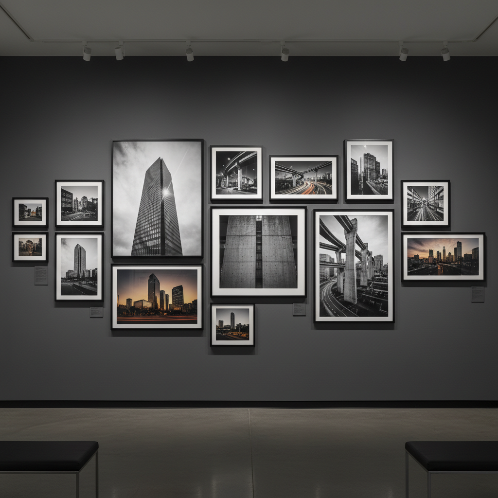 Celebrate the beauty of structures with an architectural photography gallery wall. Feature photos of iconic buildings, cityscapes, bridges, or interesting architectural details. The color palette can be monochromatic for a dramatic effect or vibrant to highlight urban energy. Use sleek, modern frames in black, white, or metal. This wall pairs well with contemporary furniture, industrial accents, and minimalist decor, fostering a sophisticated, urban, and inspiring mood.