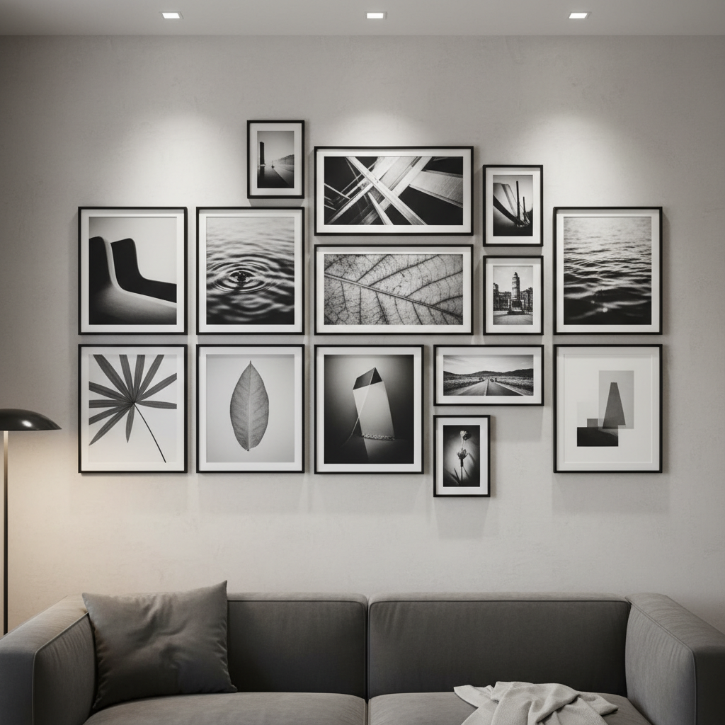 For timeless sophistication, a black and white photography grid gallery wall is a perfect choice. This style provides a powerful visual impact with its stark contrast and classic appeal. Use a consistent theme—landscapes, portraits, or street photography—and uniform frames (e.g., thin black or white metal) for a clean, cohesive look. This wall complements both modern and traditional furniture styles, adding an elegant, refined, and thoughtful mood to any space.
