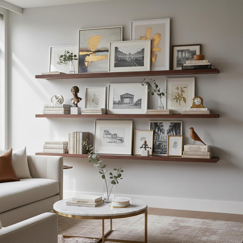 Combine art with functional decor using an open shelf art display gallery wall. Instead of hanging everything, use floating shelves to lean framed art, small sculptures, books, and decorative objects. This allows for easy rotation and layering. The color palette and materials can be varied but should maintain a cohesive aesthetic. Pair with comfortable seating and thoughtful lighting to create an inviting, curated, and dynamic atmosphere.