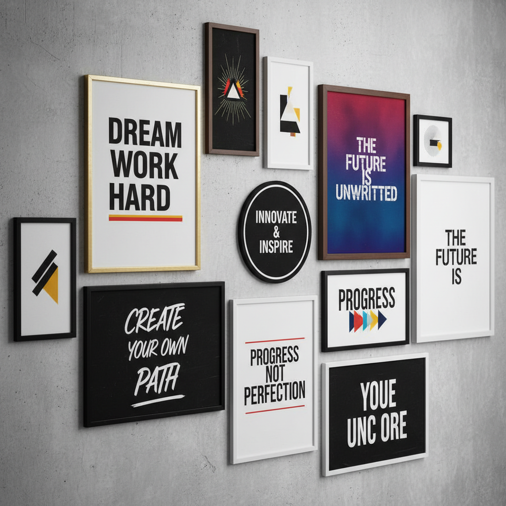 Make a statement with words using a typography triumph gallery wall. Display inspiring quotes, favorite song lyrics, or meaningful single words in various fonts and styles. The color palette can be as simple as black and white for a strong graphic impact, or incorporate a few bold accent colors. Frames can be uniform for a cohesive look or mixed for an eclectic feel. This wall pairs well with modern or industrial-style furniture, creating an intelligent, motivational, and personal atmosphere.