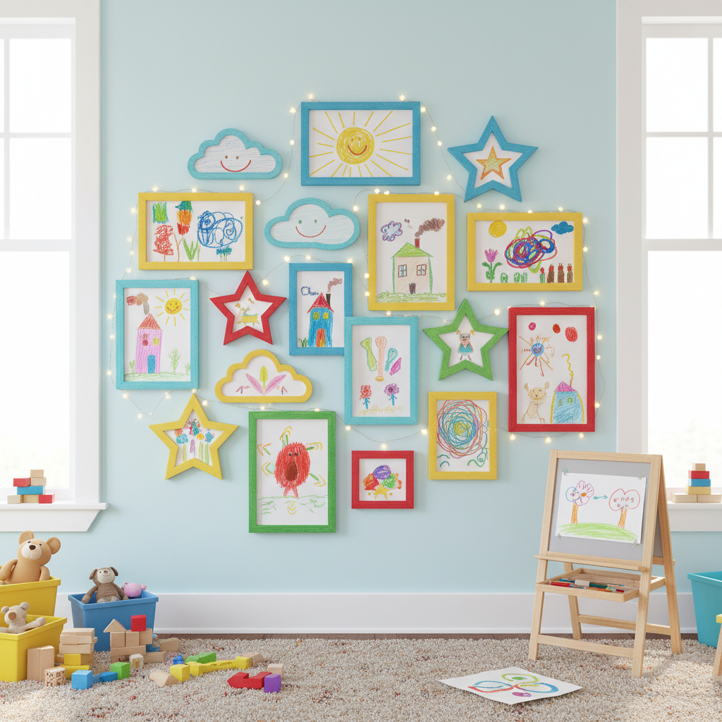 Celebrate youthful creativity with a kids’ art showcase gallery wall. Frame your children’s drawings, paintings, and crafts. The color palette will naturally be vibrant and joyful. Use simple, colorful frames or even clipboards for an informal, charming touch. This wall is perfect for a playroom or child’s bedroom, paired with playful furniture and bright textiles, fostering a fun, loving, and inspiring atmosphere for little artists.