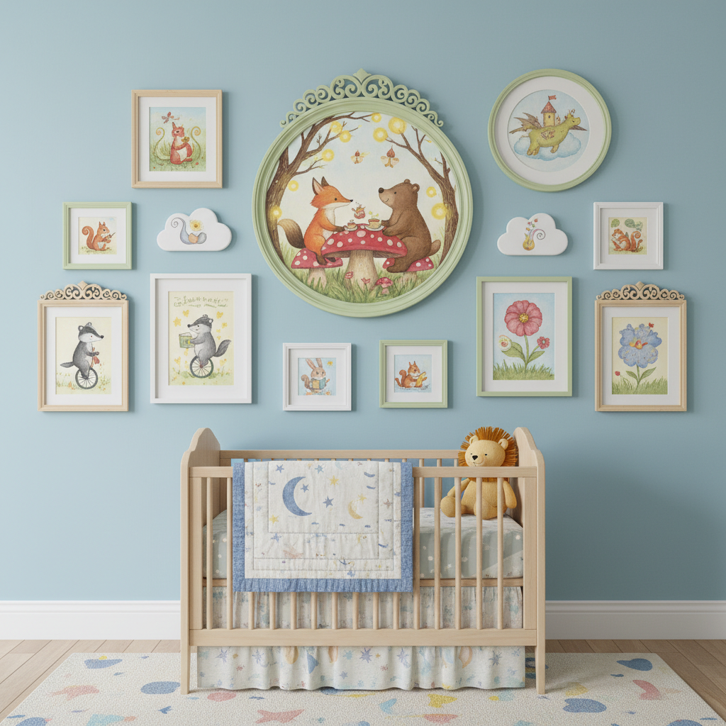 Bring beloved stories to life with a children’s book illustration gallery wall. Frame prints from classic or favorite children’s books. The color palette will be bright, whimsical, and inviting. Use simple white or colorful frames to match the playful aesthetic. This wall is perfect for a nursery or child’s room, paired with soft textiles, cuddly toys, and child-friendly furniture, creating a magical, comforting, and imaginative atmosphere.