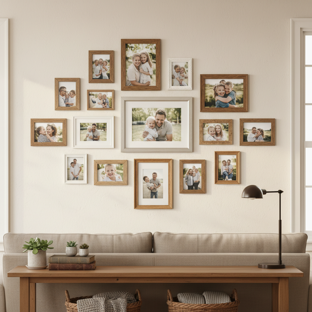 Create a heartwarming display with a family photo story gallery wall. This personal touch transforms a house into a home. Select a mix of candid shots, milestone moments, and cherished memories. A cohesive color palette can be achieved by converting all photos to black and white or sepia, or by using a consistent filter. Mix frame styles and sizes—think distressed wood, elegant silver, and simple white—to add character. This wall pairs beautifully with comfortable, inviting furniture like plush sofas and soft textiles, evoking a sense of warmth, nostalgia, and belonging.