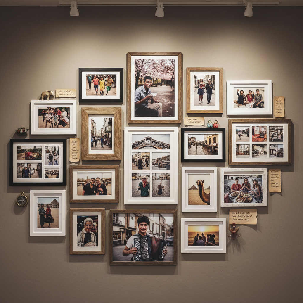 Tell your personal travel story with a narrative photography gallery wall. Arrange photos from your travels in a way that creates a visual journey. Consider a consistent color treatment for all photos (e.g., all color or all black and white) for cohesion, or embrace the natural diversity. Mix frames from different regions or cultures for an authentic touch. This wall pairs well with comfortable, well-traveled furniture and collected souvenirs, evoking a sense of adventure, memory, and personal connection.