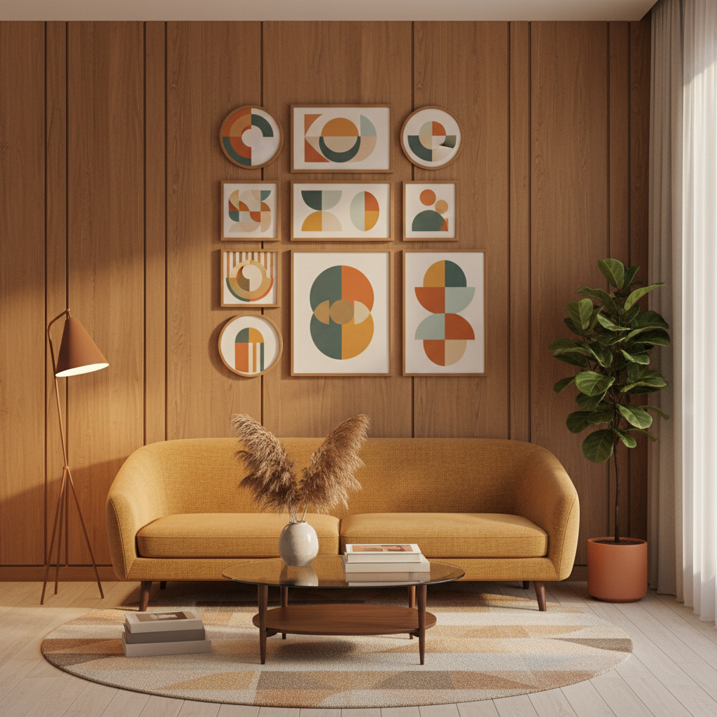 Channel retro cool with a mid-century modern vibe gallery wall. Feature abstract geometric prints, vintage travel posters, or iconic design illustrations from the era. The color palette often includes mustard yellow, olive green, teal, and burnt orange, alongside neutrals. Frames should be sleek, thin, and often in warm wood tones like teak or walnut. Pair with classic mid-century furniture—Eames chairs, credenzas, and tapered leg tables—to create a sophisticated, stylish, and nostalgic mood.