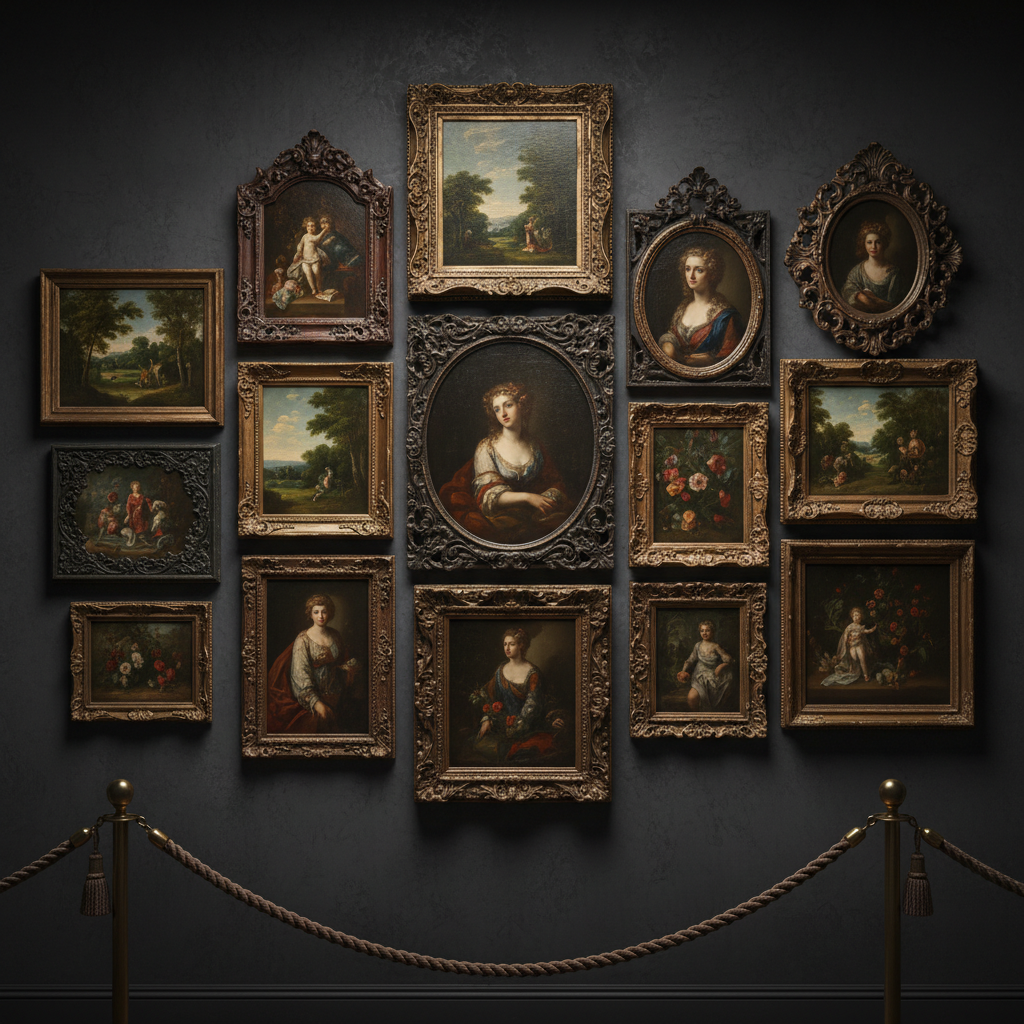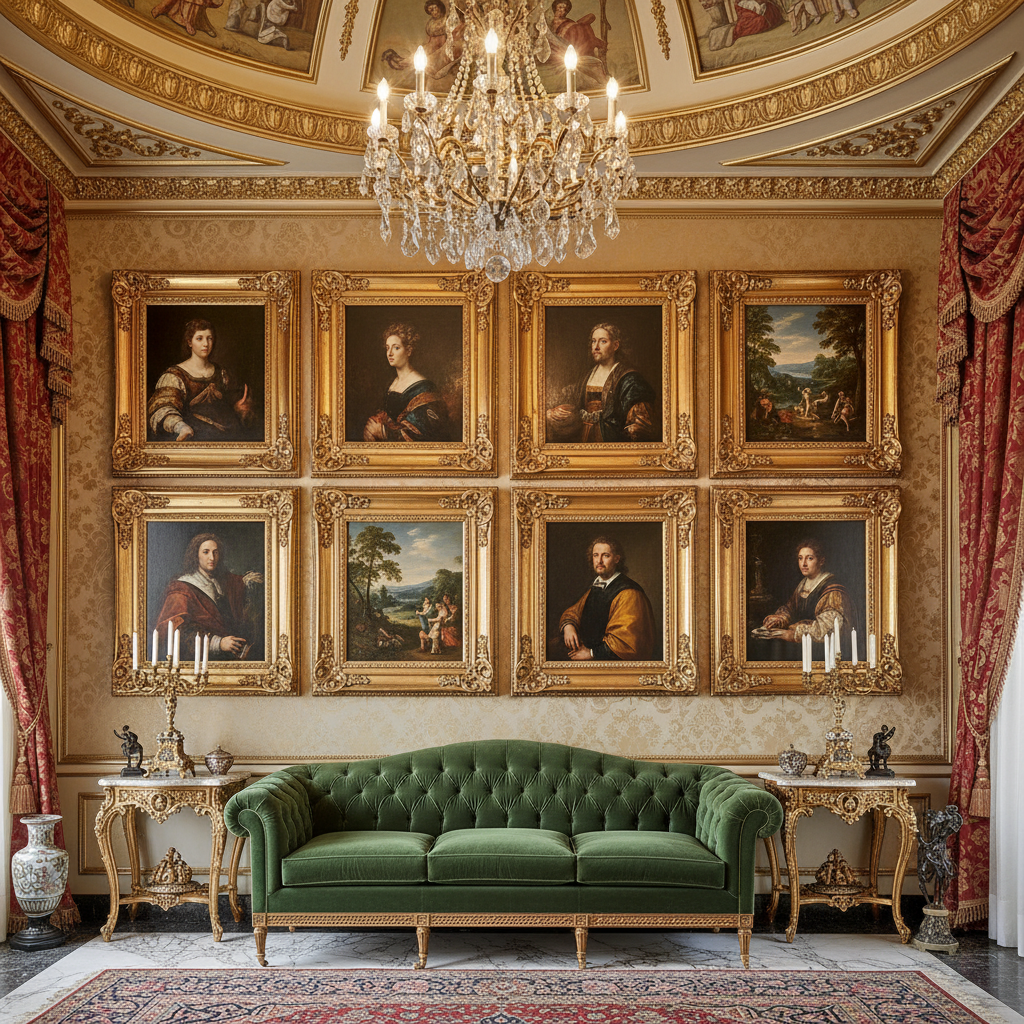 Embrace drama and sophistication with a dark and moody gallery wall. This style works best on a dark-painted wall (think deep teal, charcoal, or forest green) with art that features rich, saturated colors or dark, atmospheric scenes. Use ornate vintage frames in gold or dark wood to enhance the opulent feel. Pair with luxurious furniture in dark velvet, heavy drapery, and warm, dim lighting to create an intimate, mysterious, and highly sophisticated atmosphere.