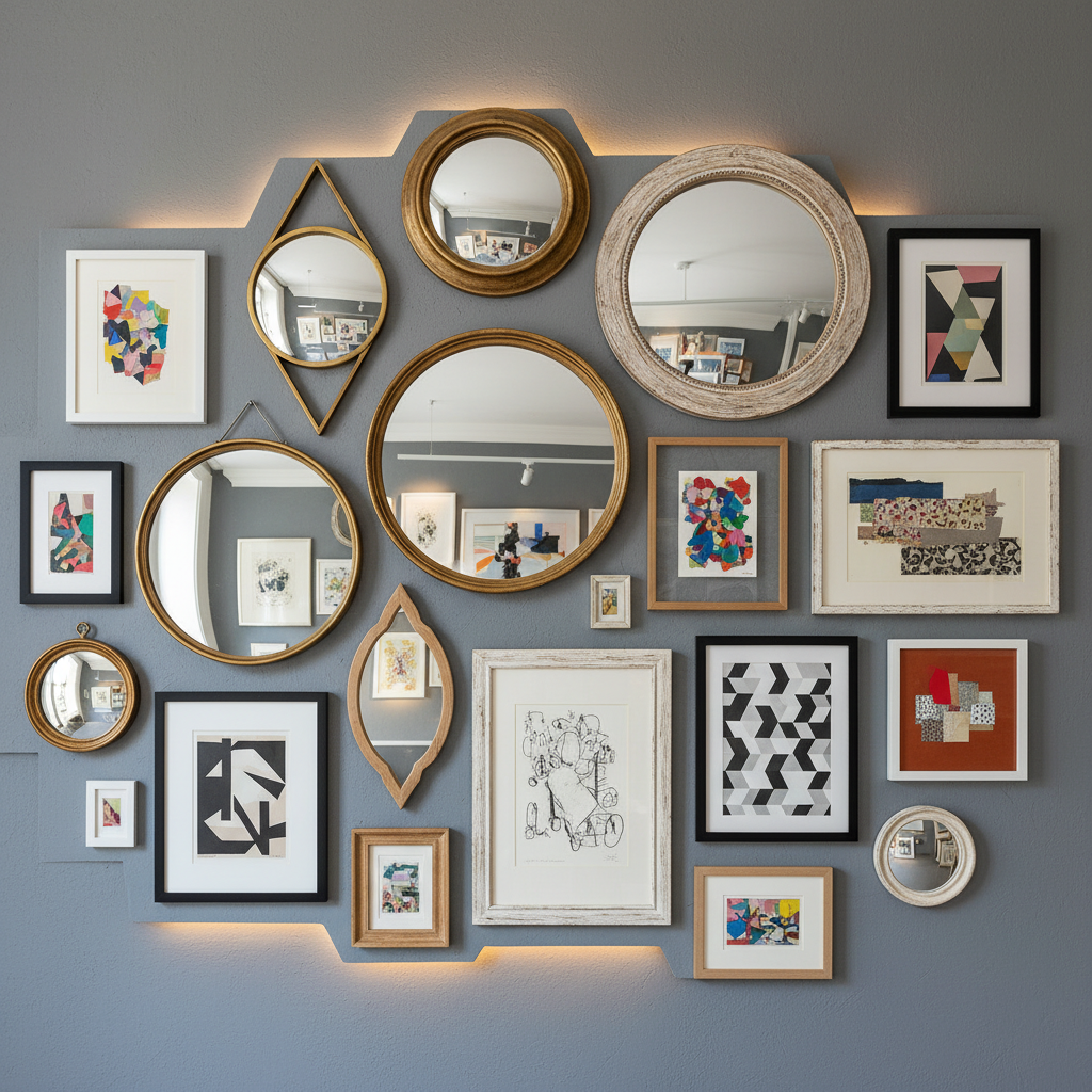 Add depth and light to any room with a mirrored magic gallery wall. Instead of traditional art, use a collection of mirrors in various shapes, sizes, and frame styles. This creates a dazzling display that reflects light and makes a room feel larger. Frame choices can range from ornate gold, distressed silver, to sleek modern black. This wall pairs beautifully with luxurious fabrics like velvet and silk, crystal accents, and metallic furniture, creating an elegant, glamorous, and expansive atmosphere.