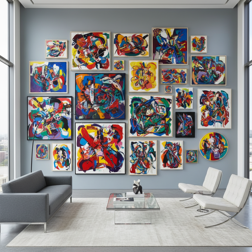 Unleash creativity with an abstract expression gallery wall. This style thrives on bold colors, dynamic shapes, and a sense of movement. Mix large-scale abstract paintings with smaller, more intricate pieces. The color palette can be a vibrant explosion of primary and secondary colors, or a more subdued yet equally impactful blend of muted tones. Choose simple, clean-lined frames in black, white, or natural wood to let the art speak for itself. Modern, minimalist furniture in neutral shades allows the wall to be the star, fostering an energetic and artistic mood.
