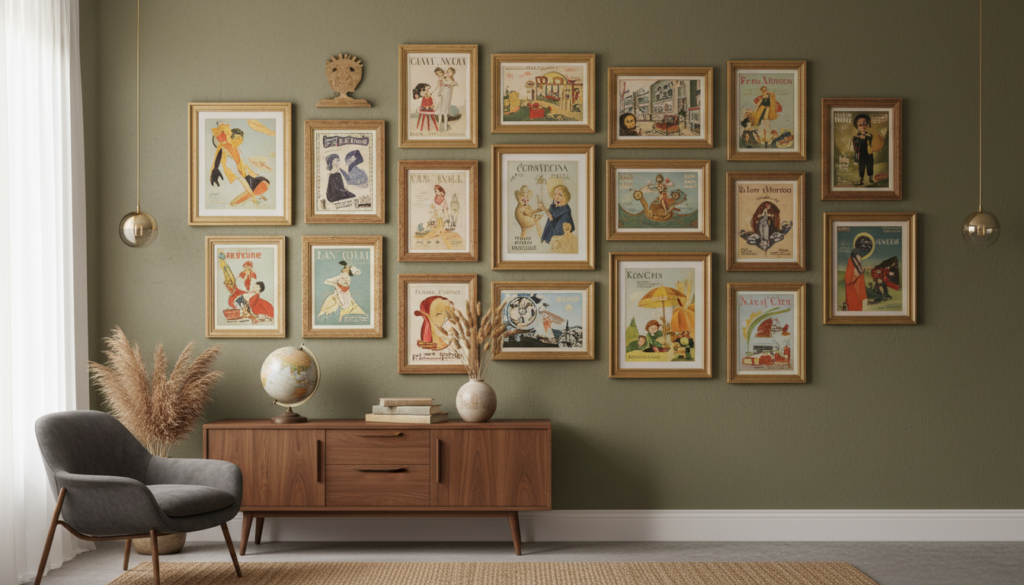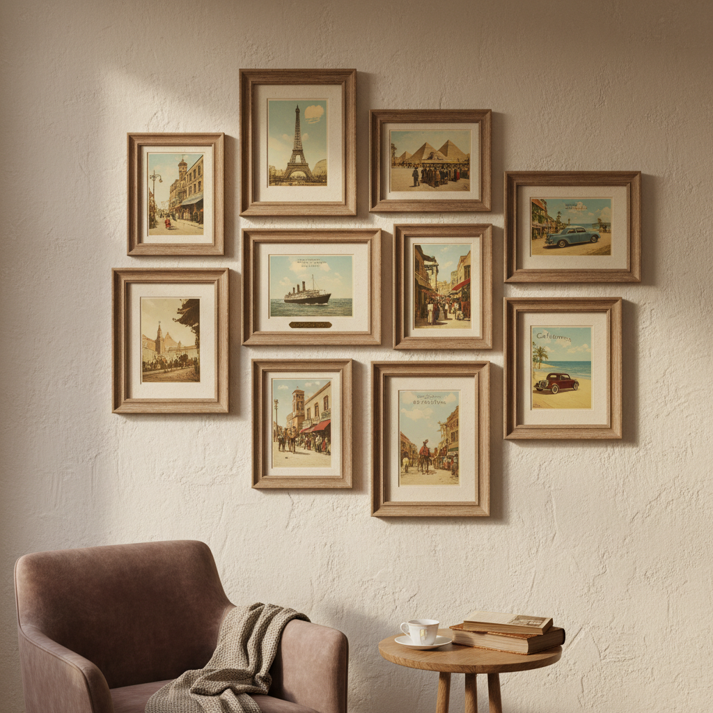 Curate a charming and nostalgic display with a vintage postcard collection gallery wall. Gather old postcards, travel posters, or retro advertisements. The color palette will naturally lean towards muted, faded tones of sepia, faded blues, and creams. Frames can be ornate gold, distressed wood, or simple dark metal, reflecting an antique aesthetic. This style pairs wonderfully with classic furniture, perhaps a Chesterfield sofa or an antique writing desk, fostering a sense of history, wanderlust, and old-world charm.