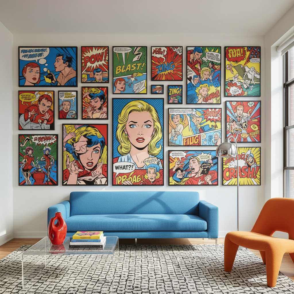 For fans of sequential art, a graphic novel panel gallery wall is a unique statement. Frame individual panels or pages from graphic novels or comic books that tell a story or capture iconic moments. The color palette will be vibrant and dynamic, reflecting the original artwork. Use simple black frames to make the panels pop. This wall pairs perfectly with modern, slightly industrial, or playful furniture, fostering an energetic, narrative, and character-filled atmosphere.