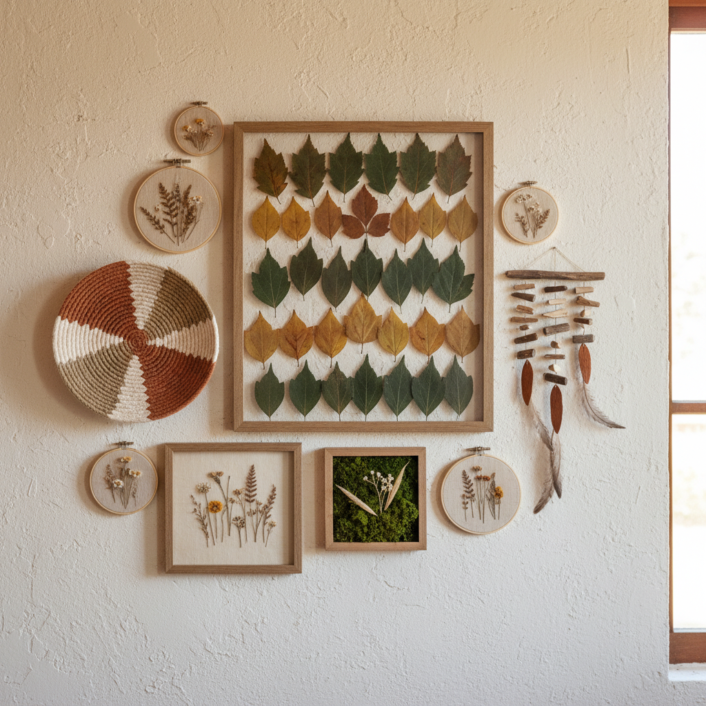 Connect with the natural world through a nature-inspired textural gallery wall. Incorporate pressed leaves, dried flowers, woven wall hangings, and prints of natural elements. The color palette will be earthy—greens, browns, muted blues, and creams. Frames can be natural wood, bamboo, or even unframed textiles. Pair with raw wood furniture, linen fabrics, and ceramic decor to create a calming, organic, and grounded atmosphere.