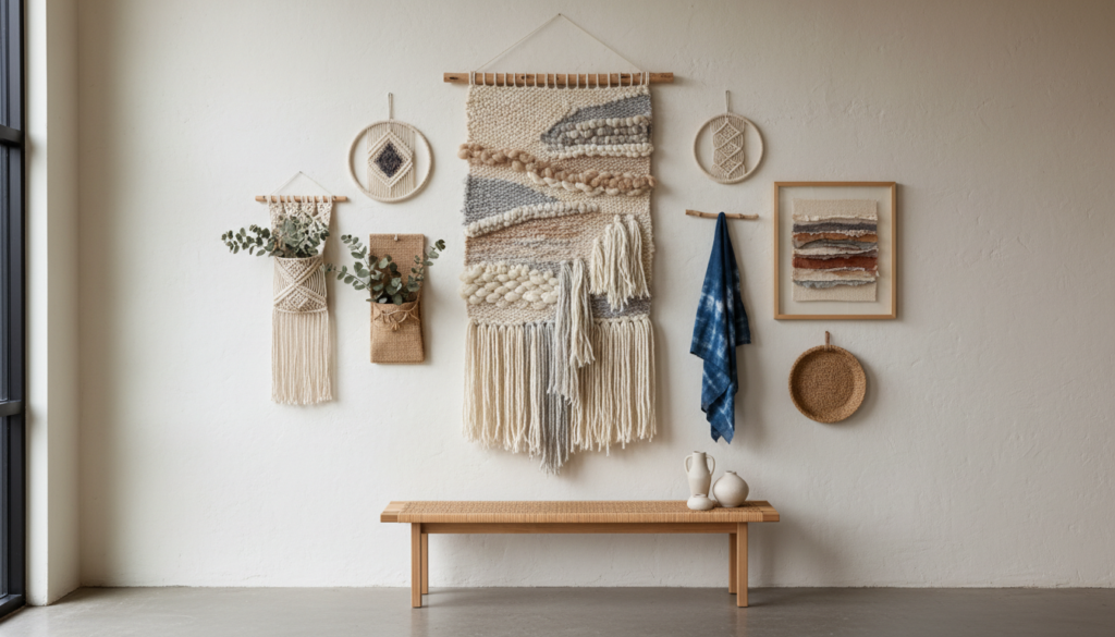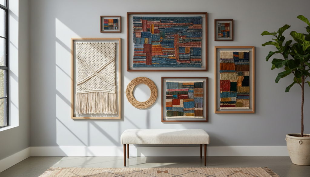 Add tactile warmth and bohemian charm with a textured wall hanging gallery wall. Mix macrame pieces, woven tapestries, textile art, and even small rugs. The color palette typically features natural, earthy tones—creams, beiges, terracotta, and soft greens. These pieces are often unframed or simply hung from wooden dowels. This wall pairs beautifully with natural wood furniture, comfortable floor cushions, and lush plants, creating a cozy, organic, and relaxed atmosphere.