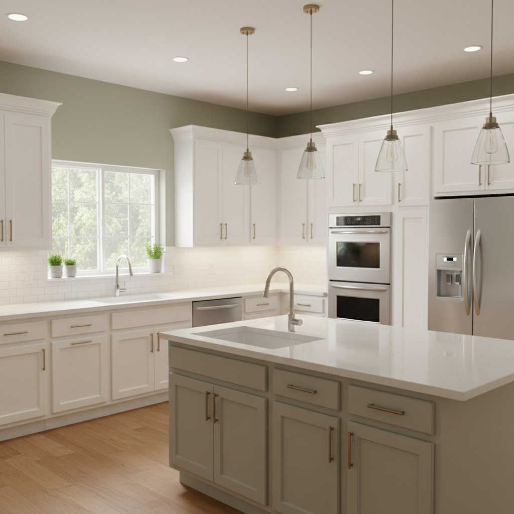 Embrace the understated elegance of classic sage green shaker-style cabinets. Paired with white quartz countertops and a simple white subway tile backsplash, this look is effortlessly chic. The color palette remains light and fresh, while brushed nickel hardware adds a touch of modern sophistication. The overall mood is one of quiet luxury and timeless appeal, perfect for everyday living.