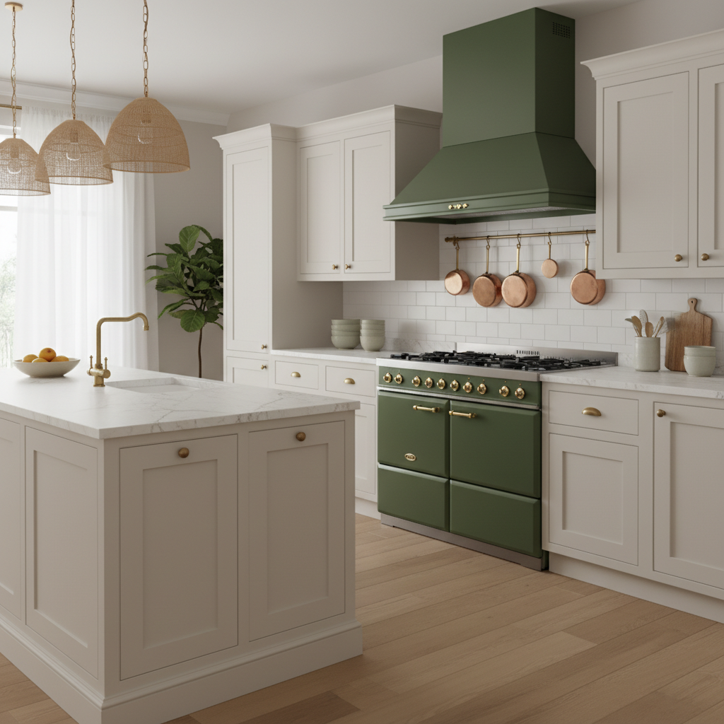 Introduce olive green in a more unconventional way with a statement olive green range cooker or refrigerator. This works particularly well in a kitchen with neutral cabinets (think white, cream, or light grey) as it allows the appliance to truly pop. It adds a vintage-inspired charm or a modern, unexpected twist, making the kitchen feel unique and characterful.