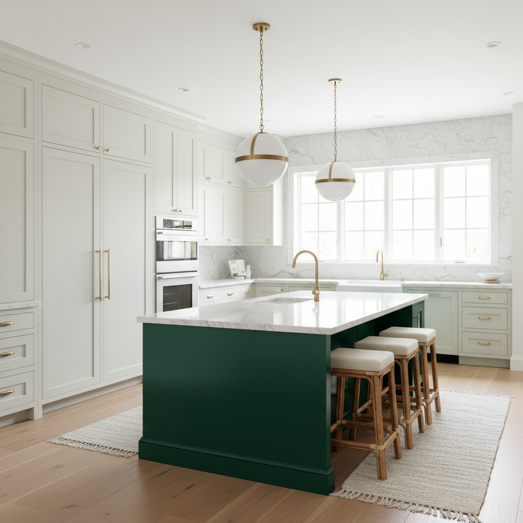 Create a stunning focal point with an emerald green kitchen island. In a kitchen with otherwise neutral perimeter cabinets (think light grey or white), this vibrant island will command attention. Pair with white quartz or light marble for the island countertop to let the green truly pop. This design adds a playful yet sophisticated element, perfect for social gatherings.