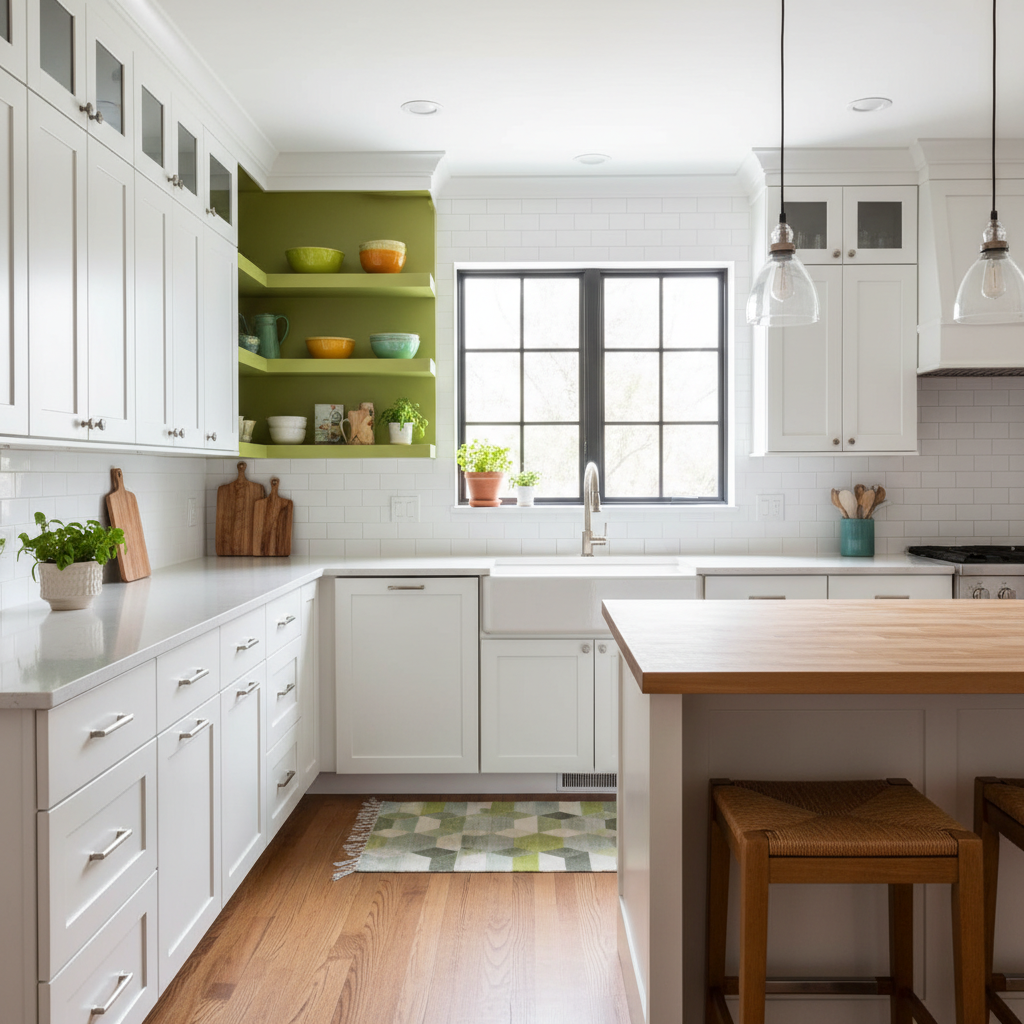 Integrate open shelving painted in a contrasting or complementary shade of green. For example, if you have white cabinets, add open shelves in a vibrant emerald or a subtle sage. Display beautiful dishware, cookbooks, and small plants to create styled vignettes. This adds personality and a touch of curated charm, breaking up the monotony of solid cabinetry.
