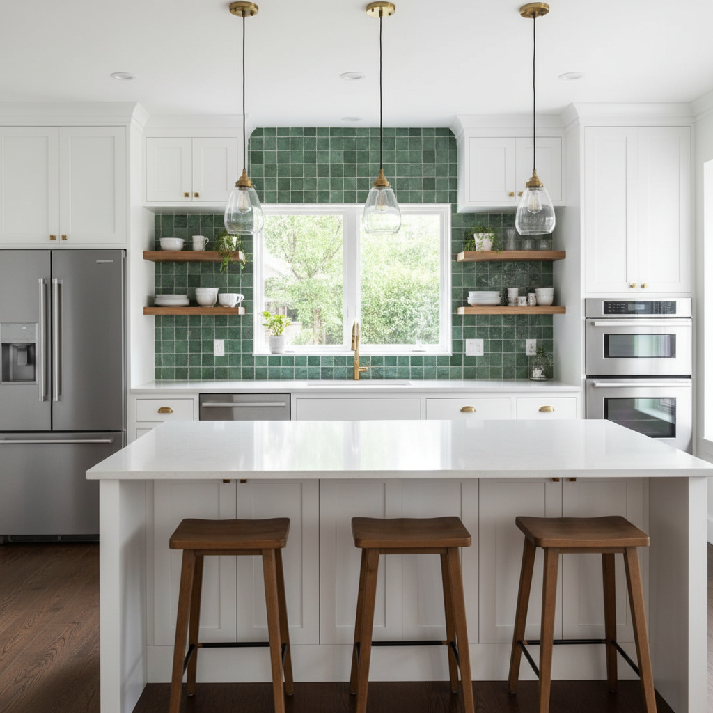 Even if your cabinets are neutral, a textured green backsplash can be a showstopper. Think handmade zellige tiles in a rich emerald, vertically stacked subway tiles in a forest green, or even a geometric pattern in a softer sage. The texture catches the light, adding dimension and a bespoke feel to the kitchen. This is an excellent way to introduce green without a full renovation.